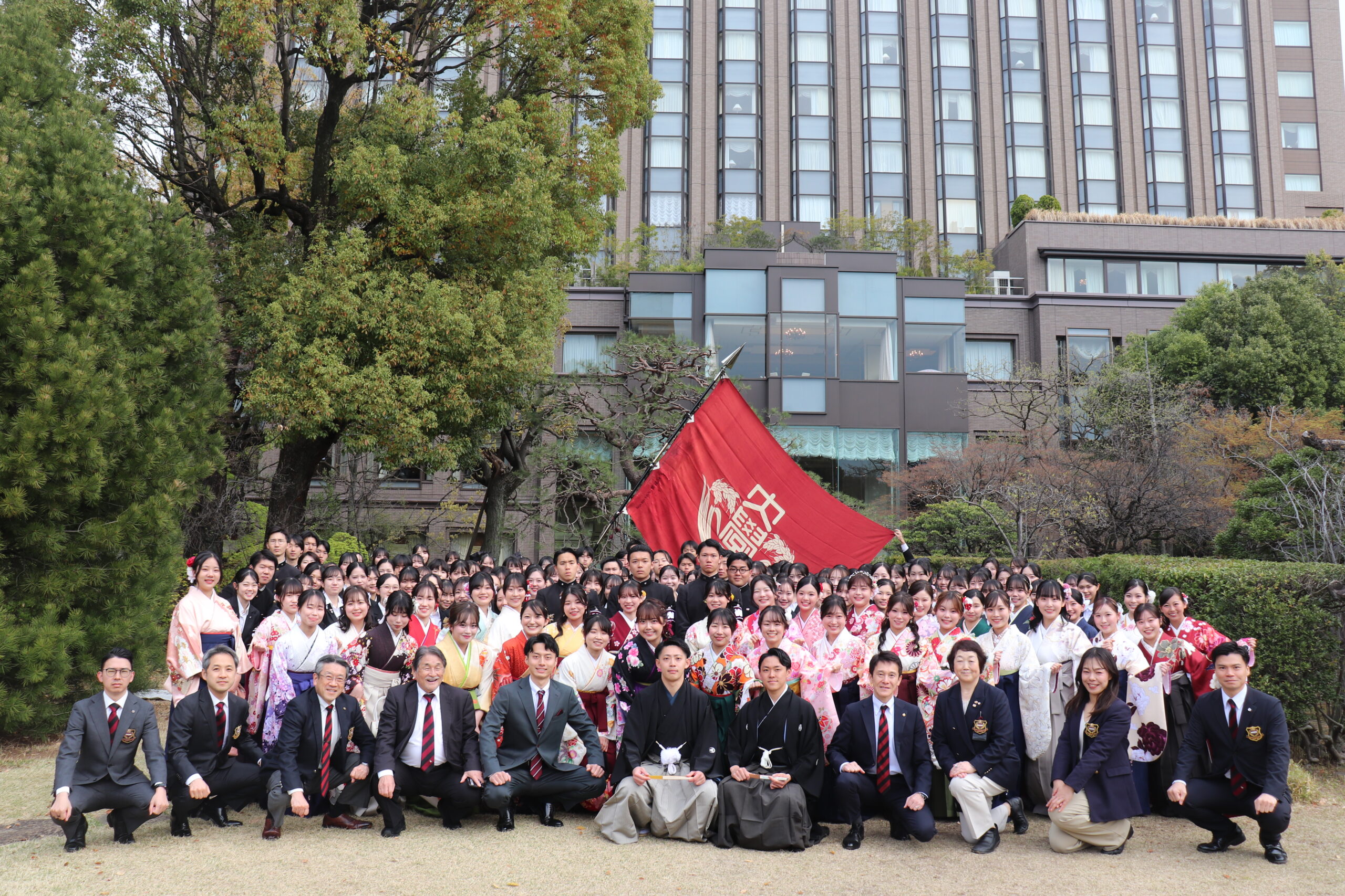 式終了後、天候がギリギリ持ち堪えた、大隈庭園で写真撮影が行われました。