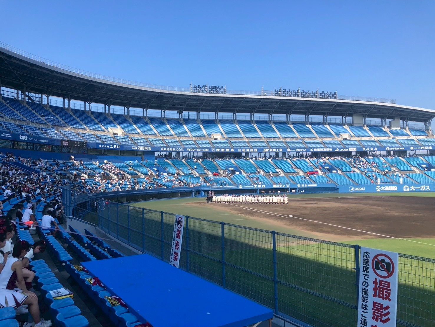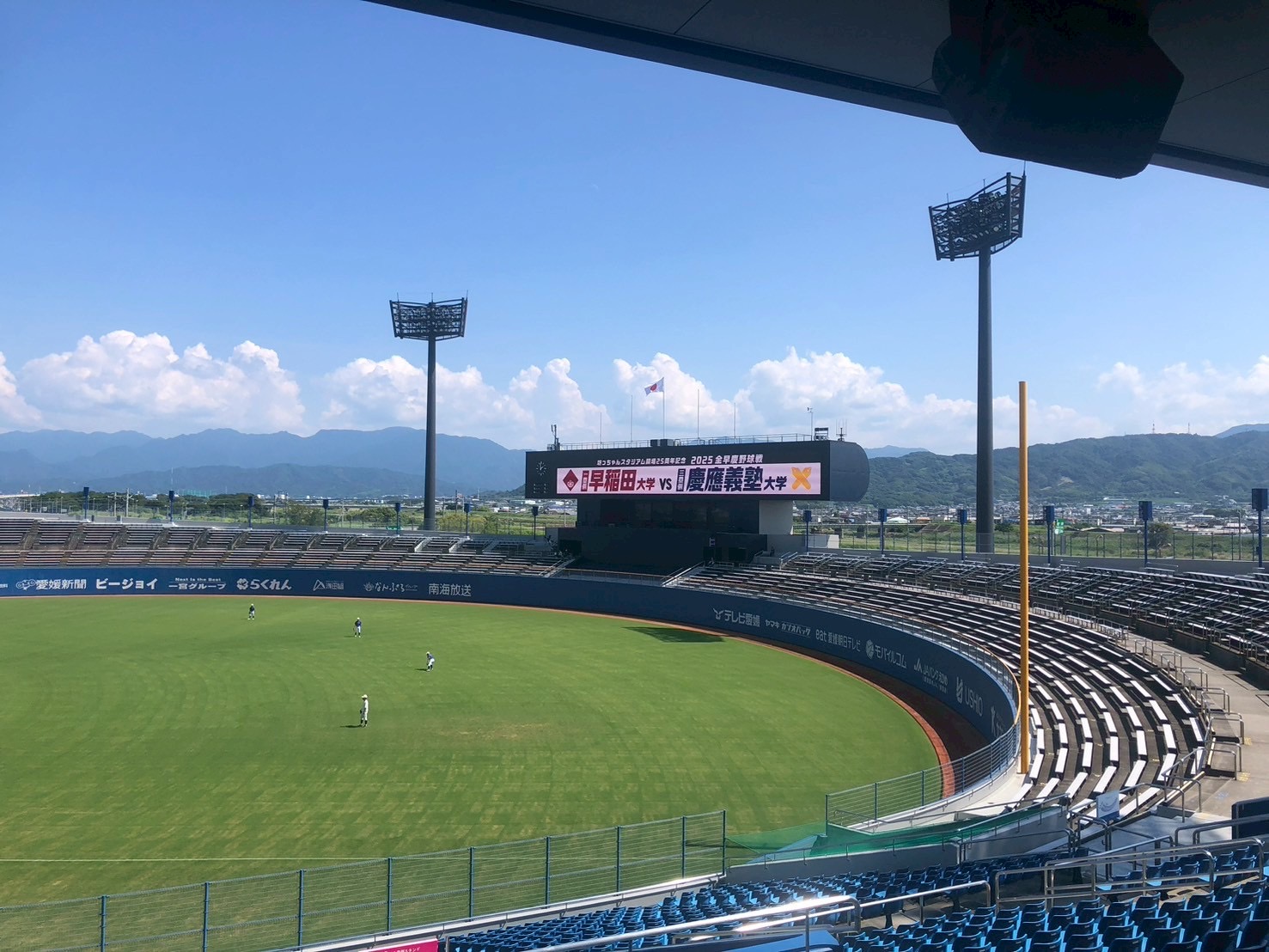 さて、松山の坊っちゃんスタジアムに到着。この球場での全早慶戦は2009年以来16年ぶりとなります。ドーム型の名古屋とは違って屋外球場ということもあり、とても暑いです。