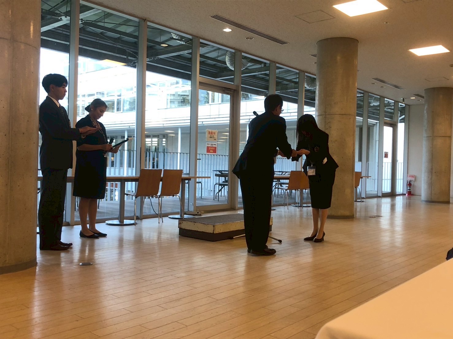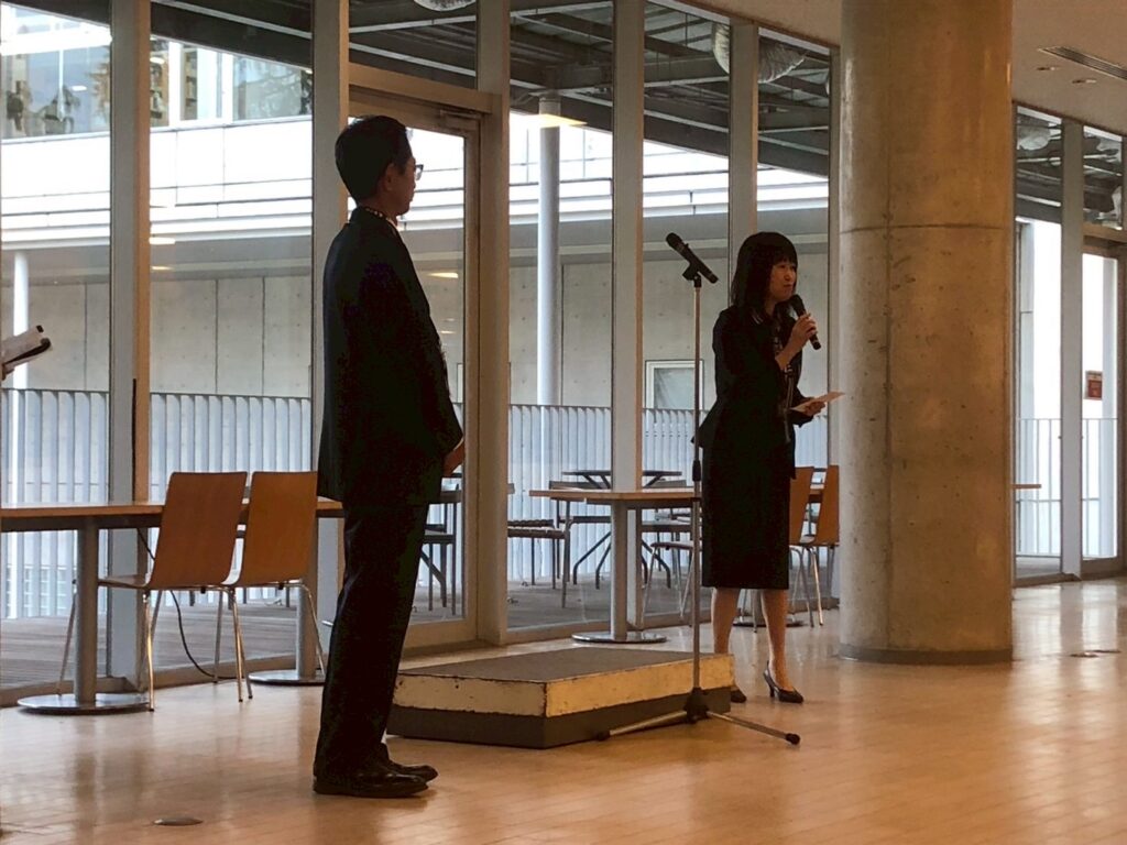 会場である生協食堂2階に移動して、いよいよ開会です。司会は、東大応援部を卒部したばかりの若手OBOGです。
